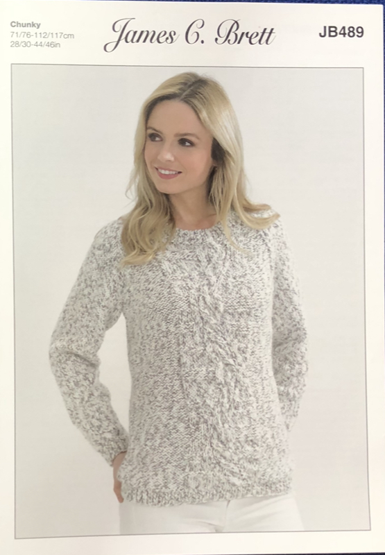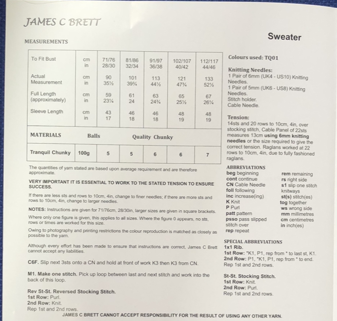 This sweater is knitted James Brett Tranquil chunky but any chunky should work. Please complete a tension square to get the correct size for your project.