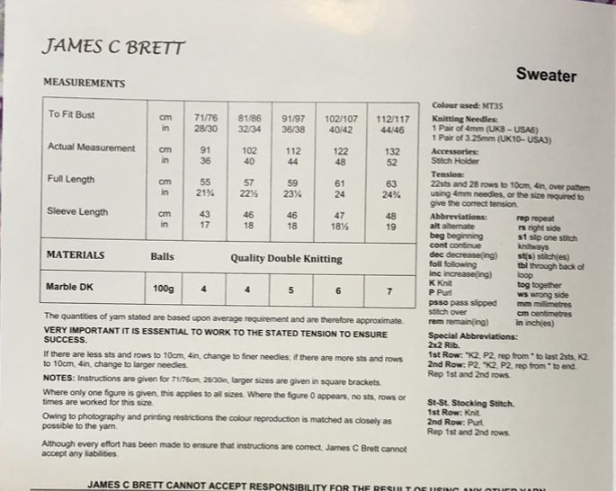 This ladies sweater is knitted in James Brett Marble DK, using 4mm and 3.25 needles, tension 22sts x 28rows.