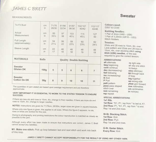 This ladies sweater is knitted in Cotton on DK or Glisten DK using 4mm and 3.25mm ,Tension 20sts x 28 rows.