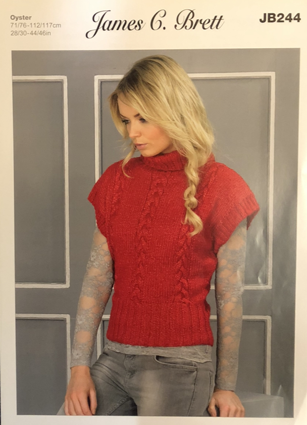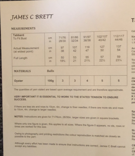 Tabbard is knitted in James Brett Oyster yarn but any suitable yarn should work. It is important that you match the suggested tension to get the correct size for your project.