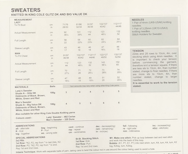 Sweaters are knitted in King Cole Big Value DK & Glitz .4mm ,3.25mm knitting needles with a tension of 22 sts x 28 rows.