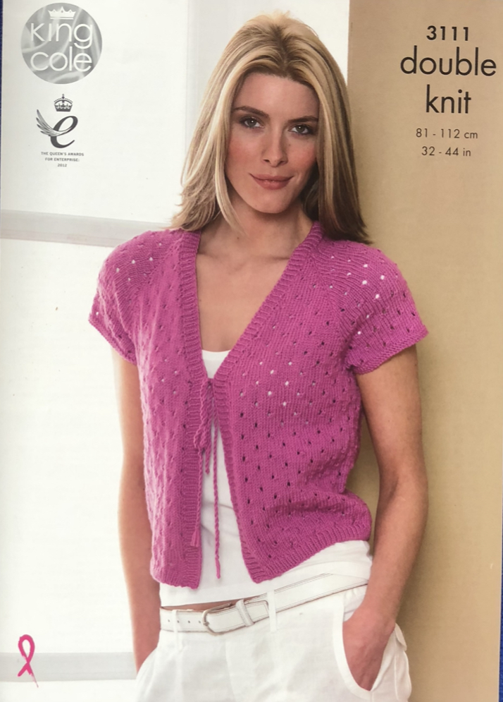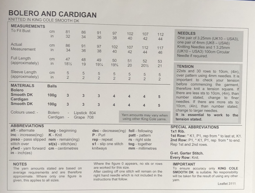 Bolero and cardigan are knitted in King cole smooth DK using 4mm and 3.25 mm ,Tension 22 sts x 30 rows.