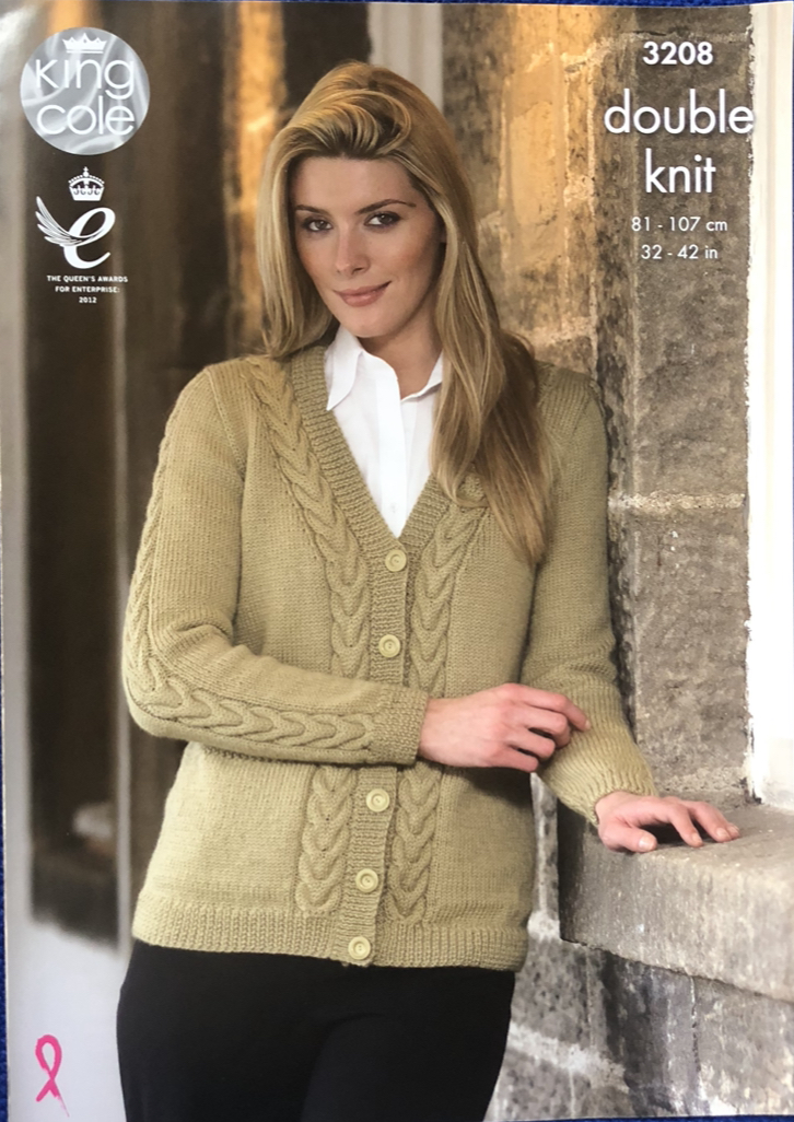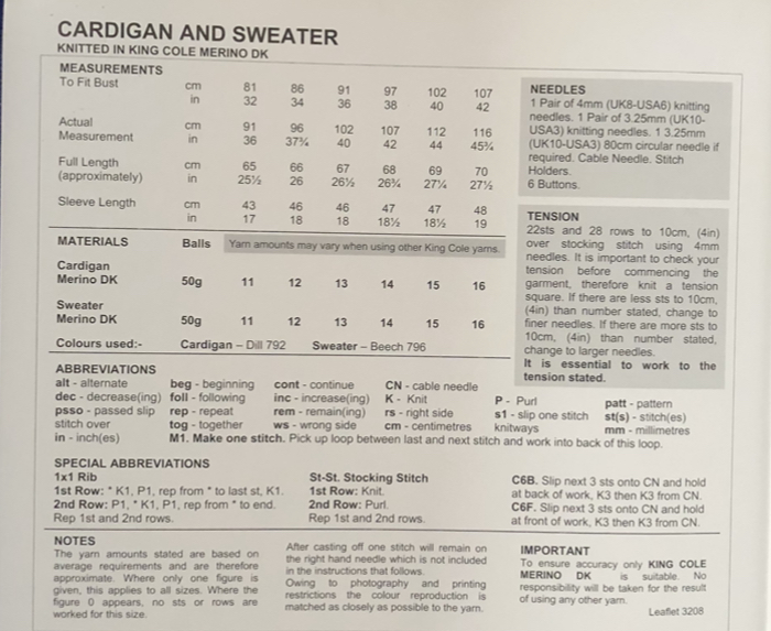 Cardigan and sweater are knitted in King cole Merino DK using 4mm and 3.25mm,Tension 22 sts x 28 rows.