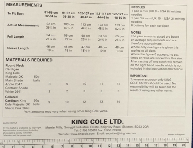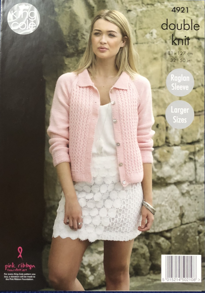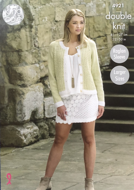 Ladies cardigans are knitted in King Cole Majestic DK using 3.25mm and 4mm,Tension 29 sts x 28 rows.