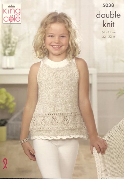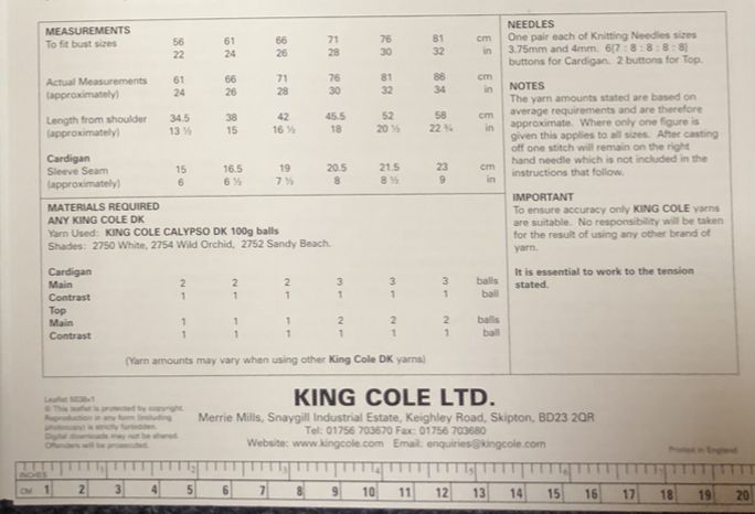 Cardigan and Top are knitted in King Cole Calypso DK but any suitable DK would work, please complete a tension square to get the correct size for your project.