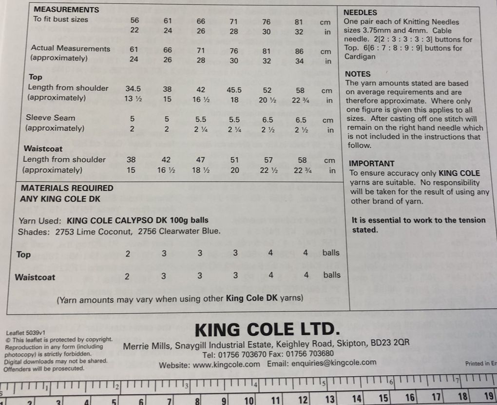 Top and waistcoat are knitted in King Cole Calypso DK but any suitable DK would work, please complete a tension square to get the correct size for your project.
