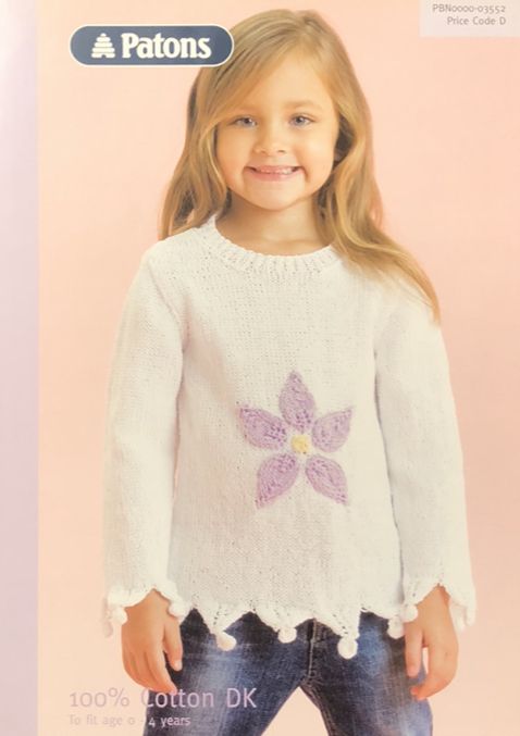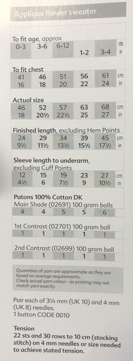 Appliqué flower sweater is knitted in Patons 100% cotton DK but any suitable DK should work, please do a tension square to get the correct size for your project.