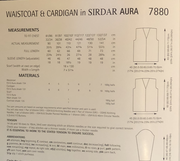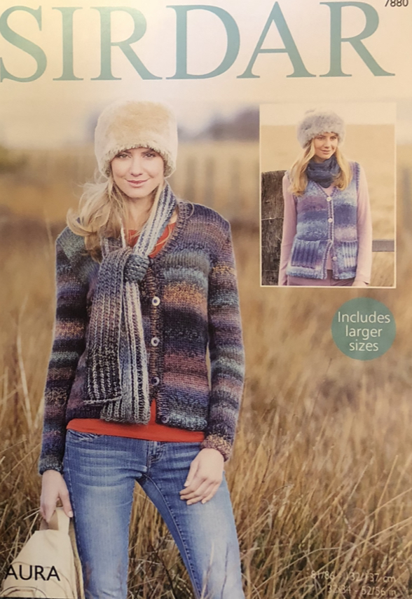 This waistcoat & cardigan is knitted in Sirdar Aura but any chunky should work ,suggest doing a tension swatch to get the correct size for your project.
