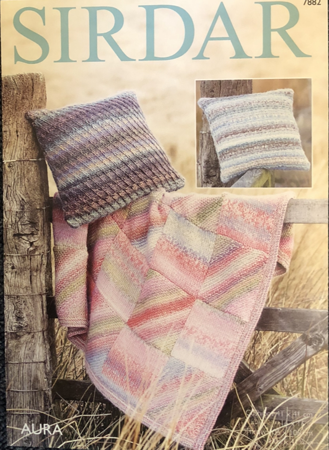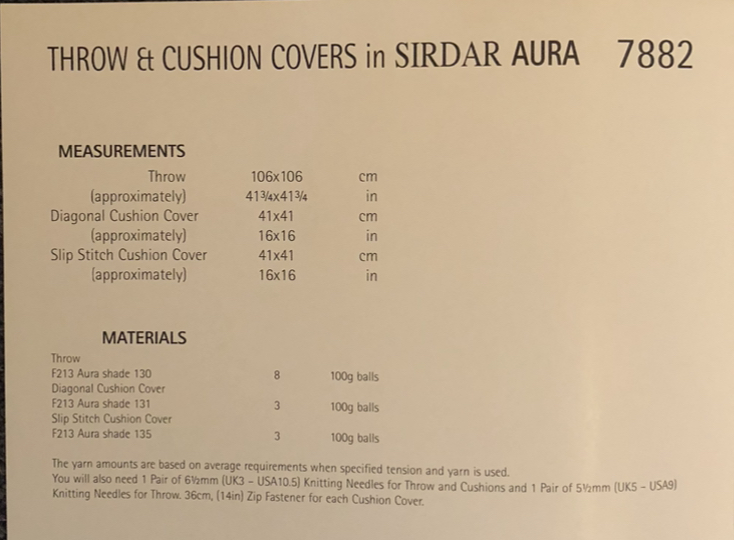 This throw & cushion covers hats,scarf are knitted in Sirdar Aura but any chunky should work ,suggest doing a tension swatch to get the correct size for your project.