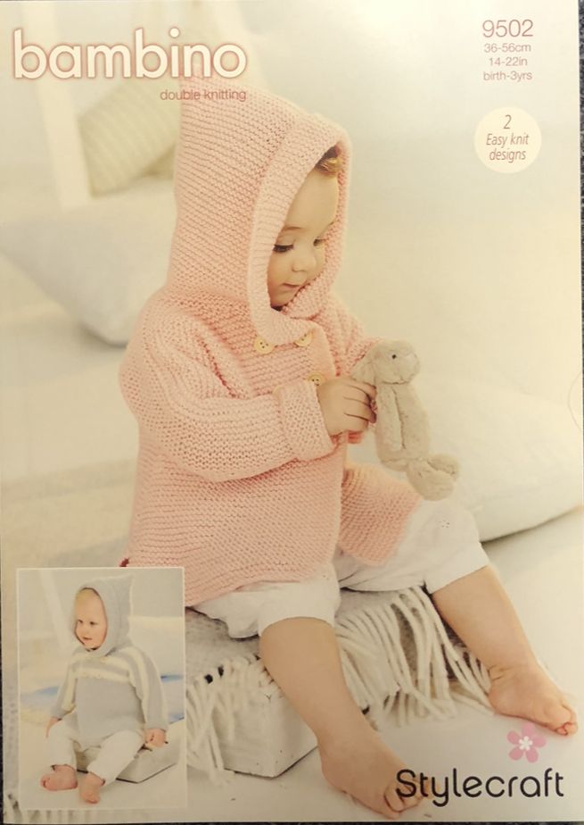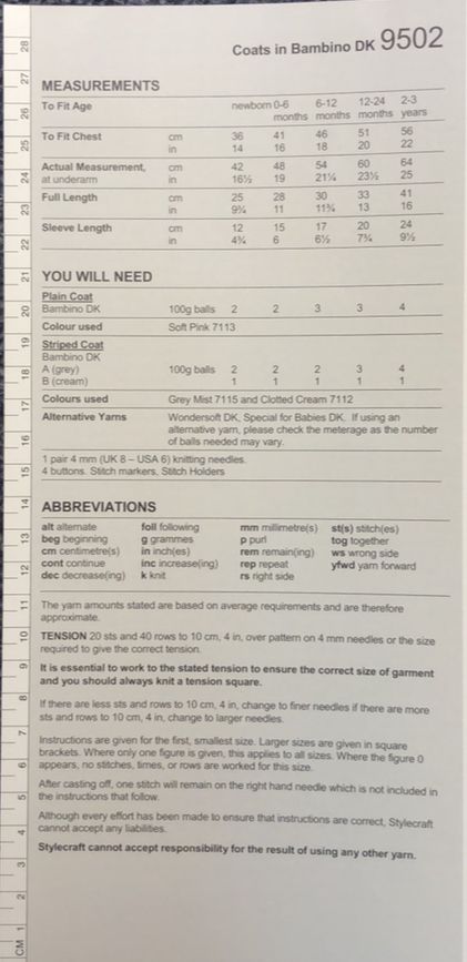 Coat knitted in Stylecraft Bambino DK using 4mm knitting needles, any suitable DK can be using ,please do a tension square to get the correct size for your project .
