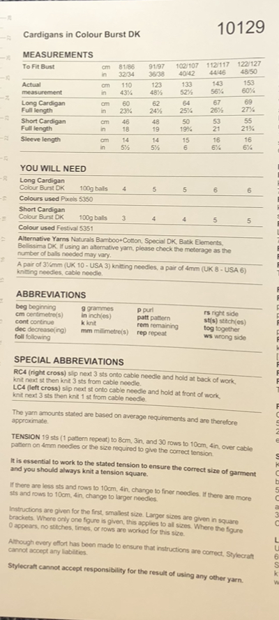 This Stylecraft  cardigan is knitting in colour burst but any suitable DK should work. Please check the meterage as the number of balls may vary and complete a tension square to get the correct size for your project.