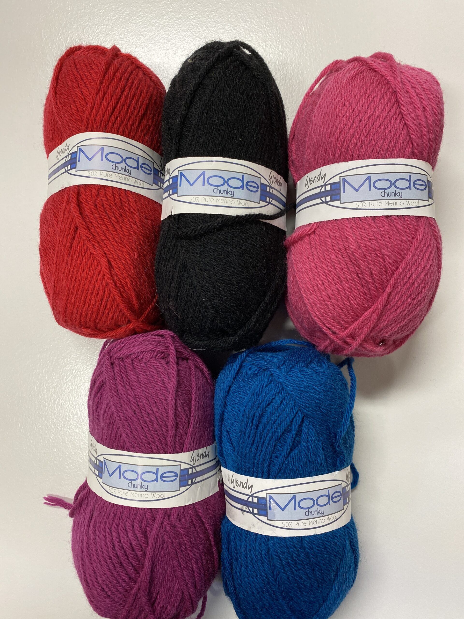 | Wendy Mode Chunky | red 210, Pink 208, 213 Teal, 220 Black, 209 Cerise |