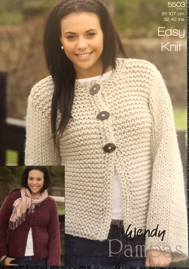 This easy knit jacket is knitted in Wendy Pampas but any super chunky yarn should work, it is important to check your tension to get the correct size for your project.