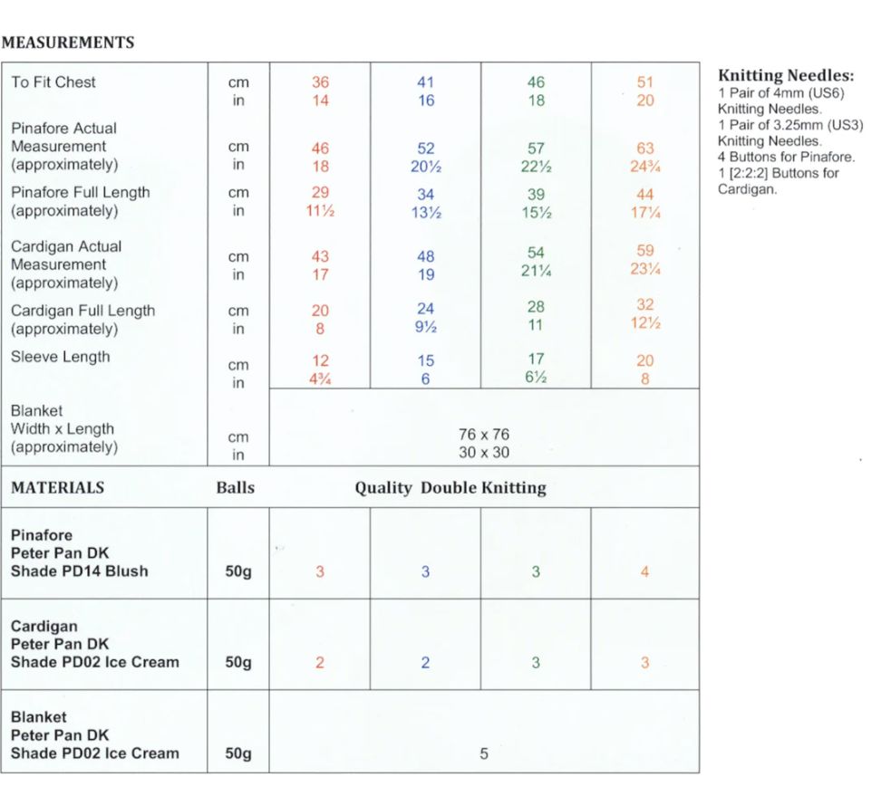 Wendy Wools Intermediate Knit baby pattern for a pinafore,cardigan, blanket in peter Pan DK( click link below) size 14 -20inches.