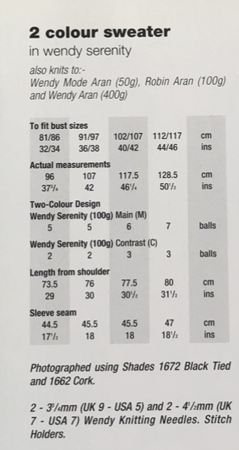 Two colour sweater in Wendy serenity Aran  but any suitable aran should work. Please do a tension square to get the correct size for your project.
