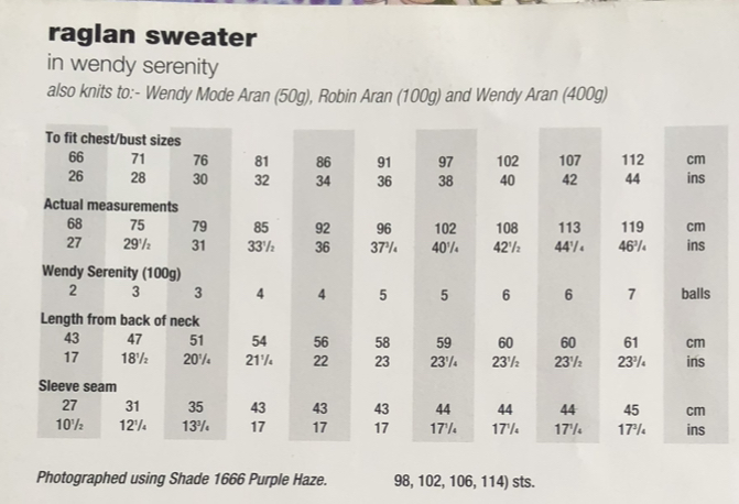 raglan sweater in Wendy serenity Aran  but any suitable aran should work. Please do a tension square to get the correct size for your project.