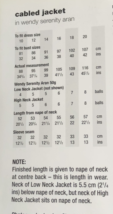 Cable jacket in Wendy serenity Aran but any suitable aran should work. Please do a tension square to get the correct size for your project.