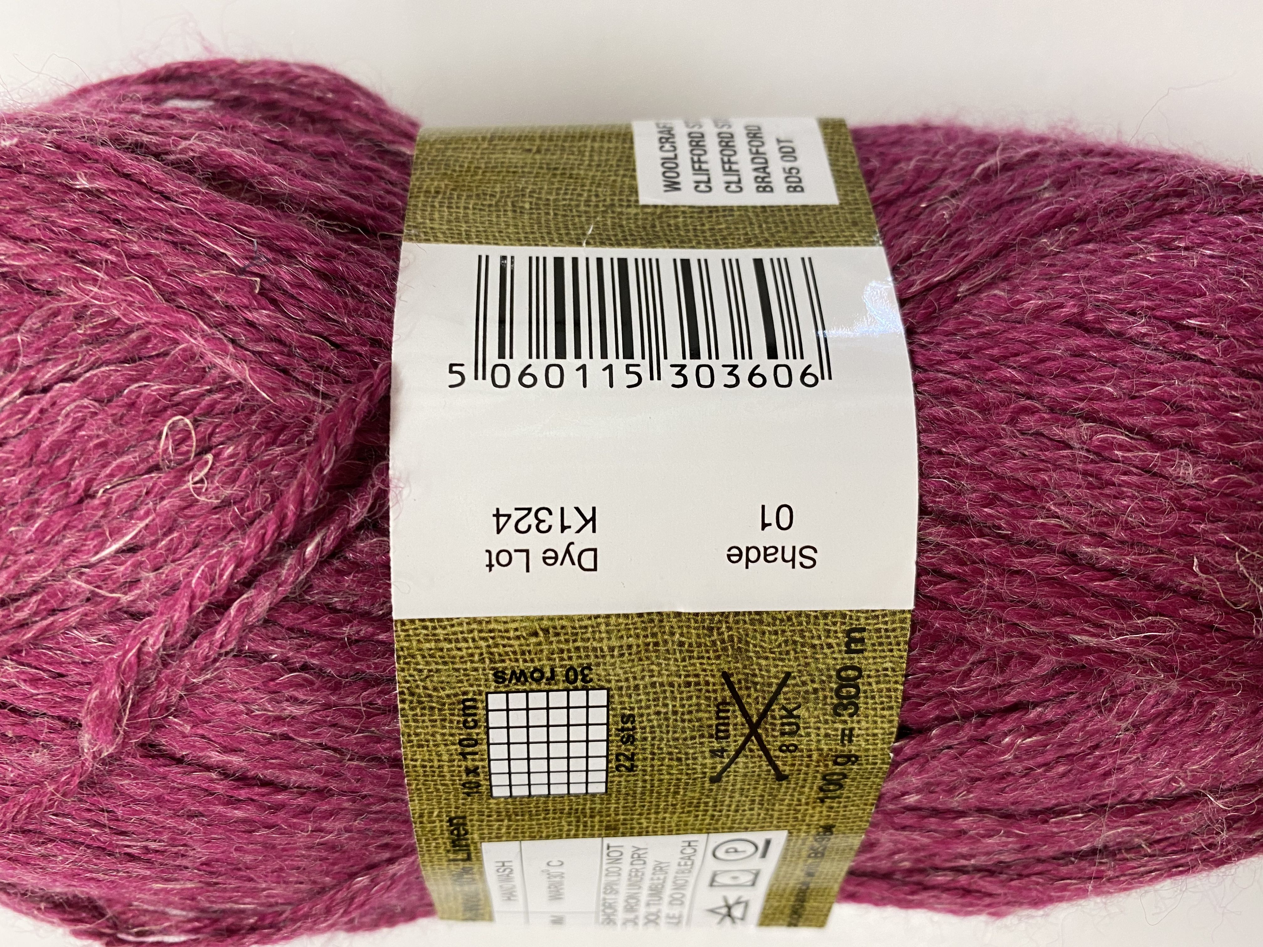 | Woolcraft Linen Dream DK | 04 Salmon, 02 Brown, 05 Purple, 06 Blue, 03 Green, 01 cerise |